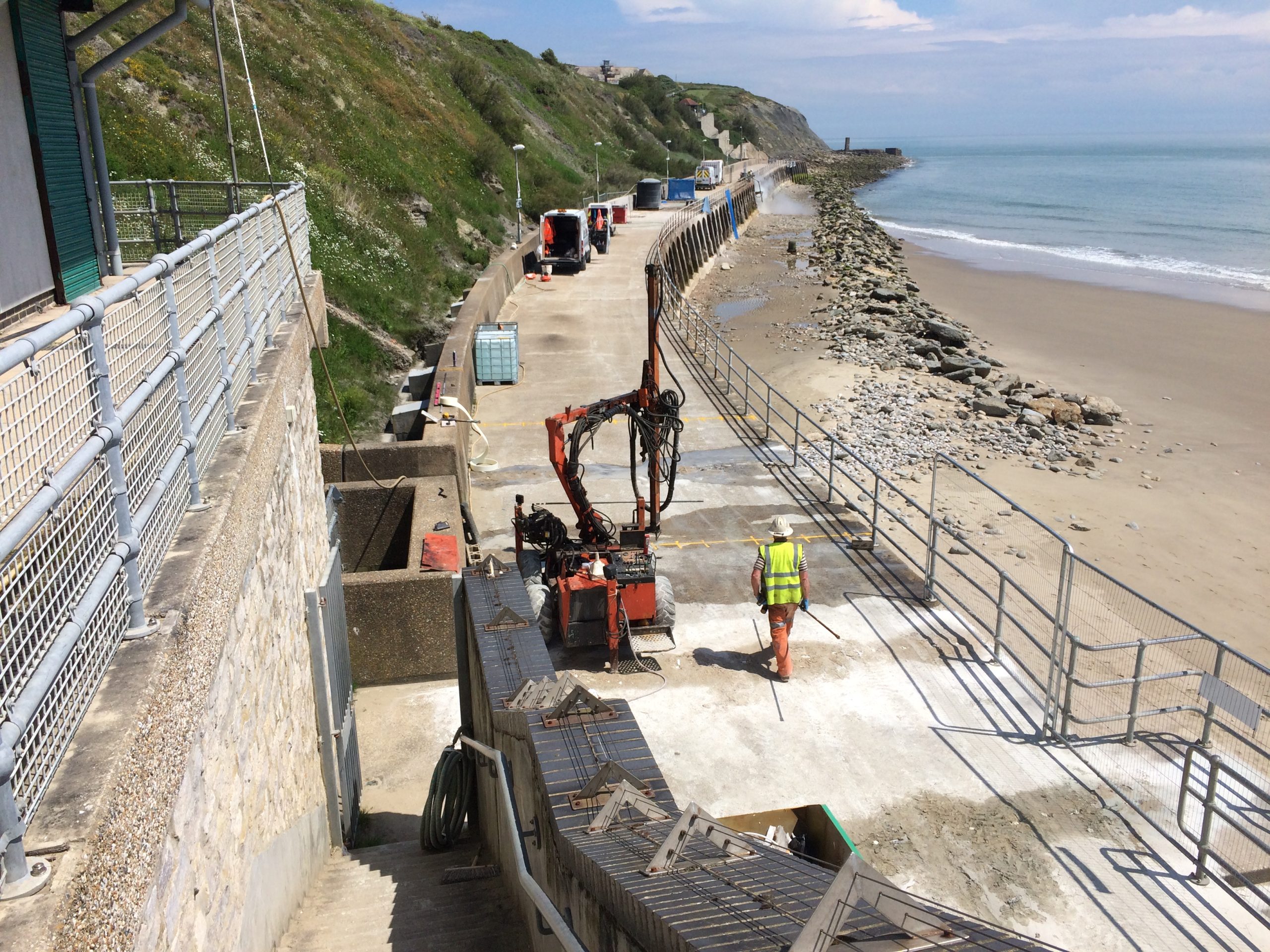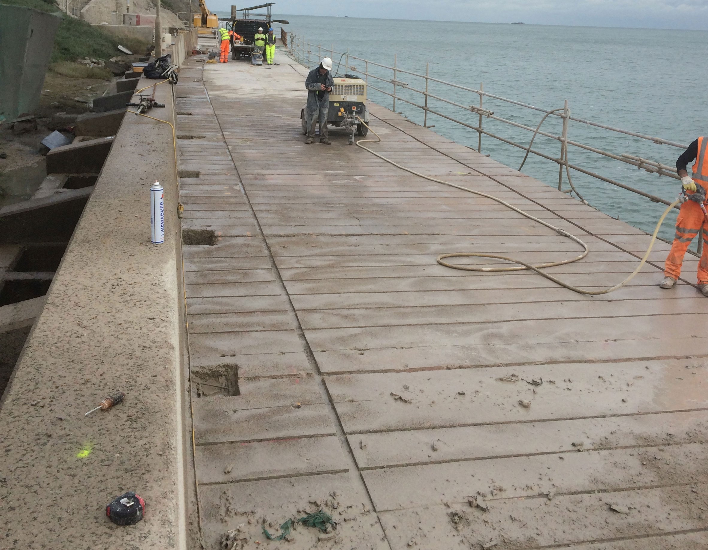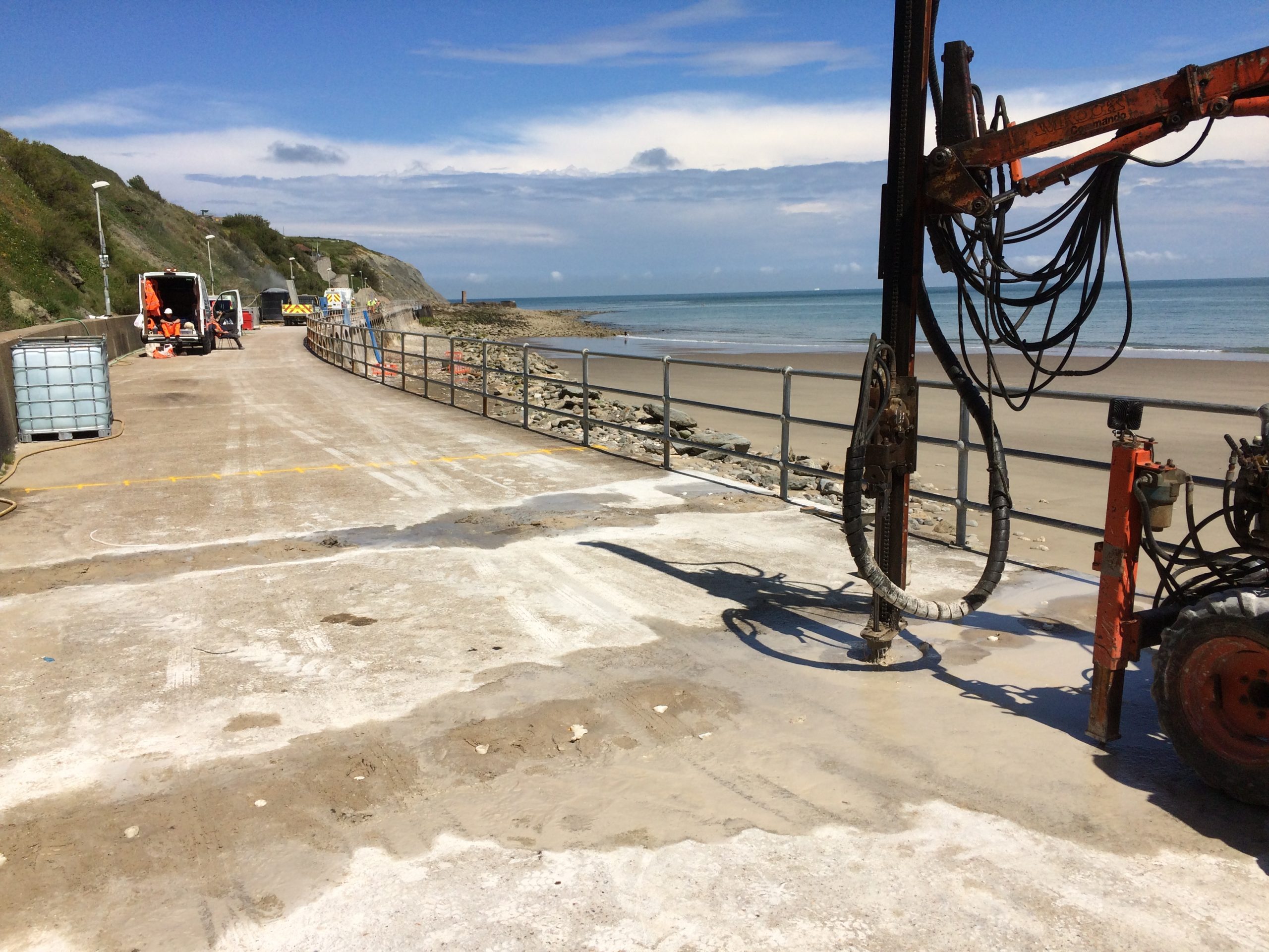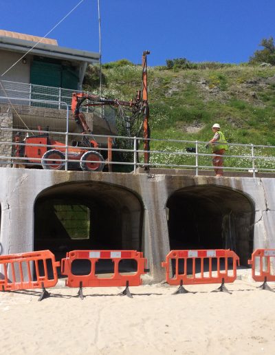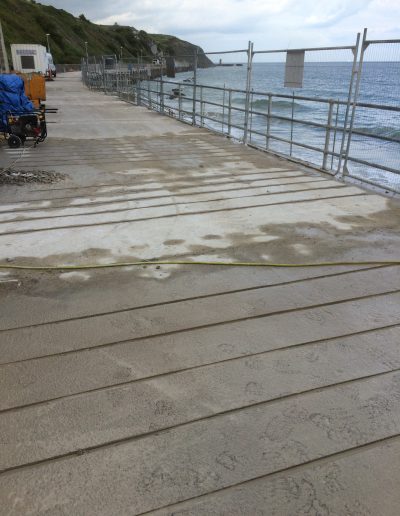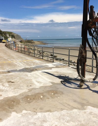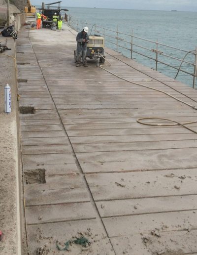 The Coronation Parade promenade and breakwater in Folkestone, Kent was built in the late 1930s. It consists of 91 reinforced concrete arches and promenade with a retaining wall to the rear. After many years exposed in the harsh sea environment the structure had begun to fail, sections of the concrete had started spalling and corrosion was eating away at the steel reinforcement contained within the concrete. The local council contracted a specialist company to carry out comprehensive concrete repairs and at the same time install into each arch of the structure a corrosion protection system. Diamond Edge Drilling Ltd were called in by the concrete repairs contractor to carry out all of the drilling and chasing required for the installation of the system anodes and cabling. The main elements of our work included but were not limited to: