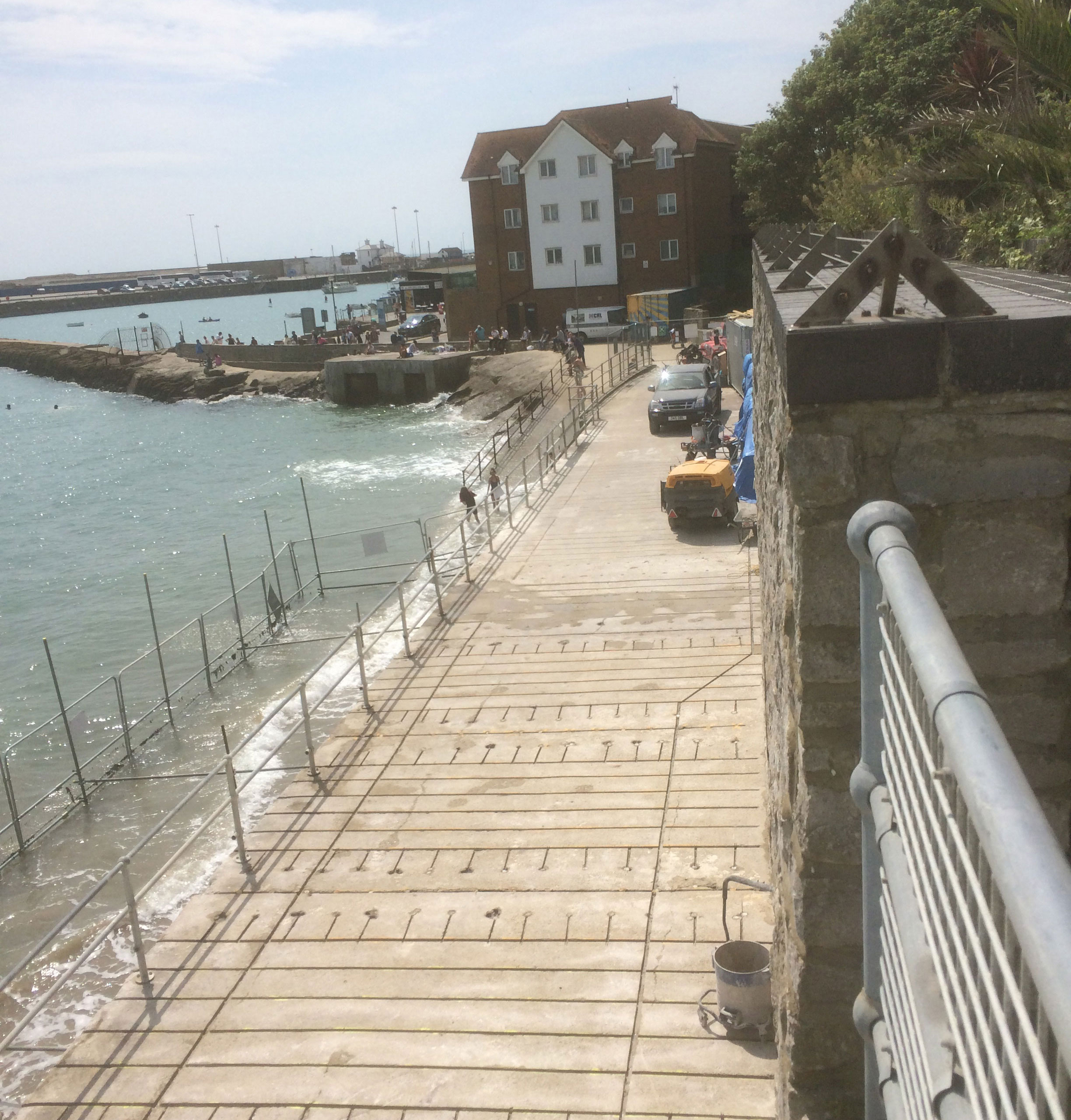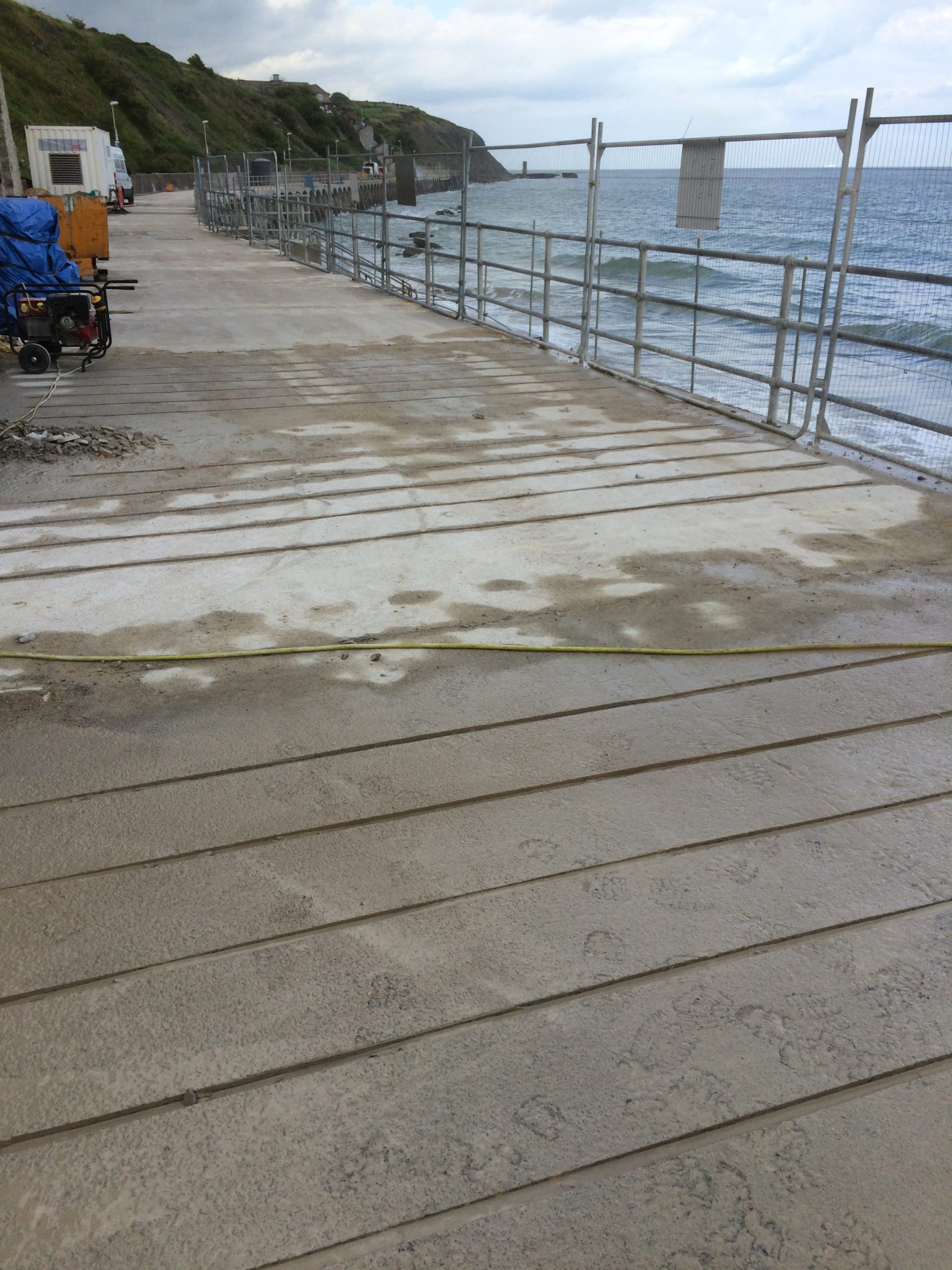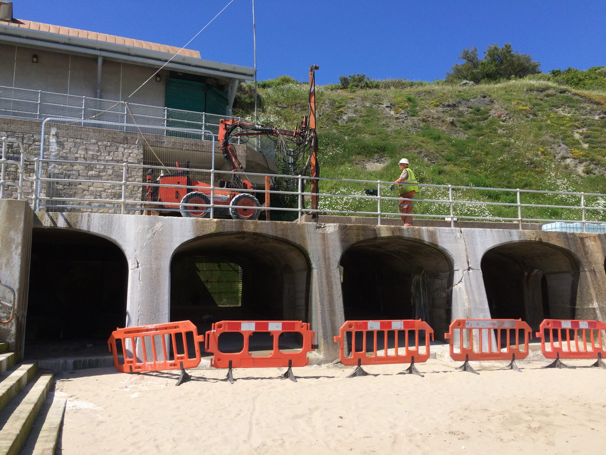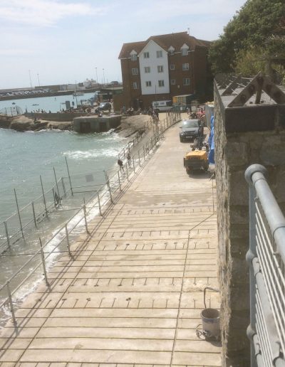 The Coronation Parade promenade and breakwater in Folkestone, Kent was built in the late 1930s. It consists of 91 reinforced concrete arches and promenade with a retaining wall to the rear. After many years exposed in the harsh sea environment the structure had begun to fail, sections of the concrete had started spalling and corrosion was eating away at the steel reinforcement contained within the concrete. The local council contracted a specialist company to carry out comprehensive concrete repairs and at the same time install into each arch of the structure a corrosion protection system. Diamond Edge Drilling Ltd were called in by the concrete repairs contractor to carry out all of the drilling and chasing required for the installation of the system anodes and cabling. The main elements of our work included but were not limited to: